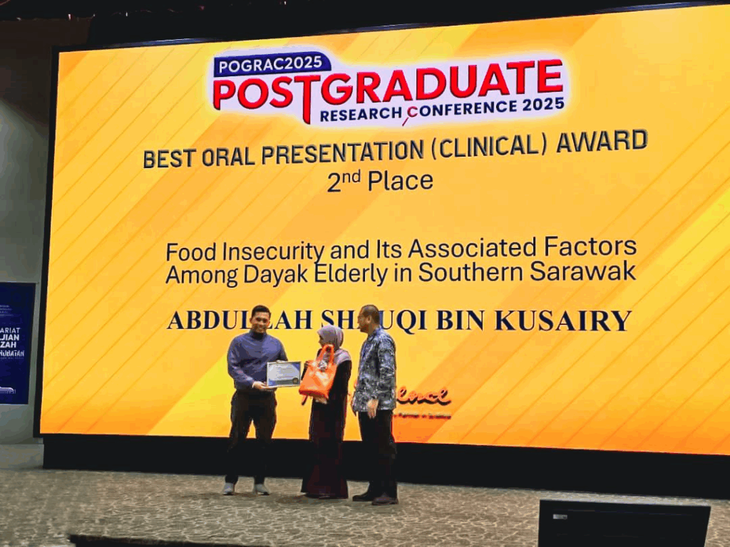 Dr Abdullah Shauqi bin Kusairy won second place in the Best Oral Presentation (Clinical) category. His study examined food insecurity among Dayak elderly in southern Sarawak, where more than one in four respondents reported challenges in securing adequate food.