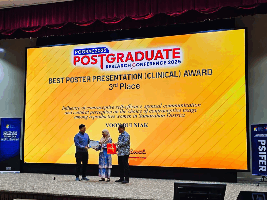 Dr Voon Bui Niak received third place in the Best Poster Presentation (Clinical) category. Her study investigated contraceptive use among reproductive women in Samarahan District, focusing on self-efficacy, spousal communication and cultural perception.