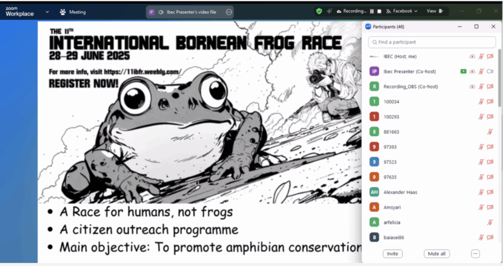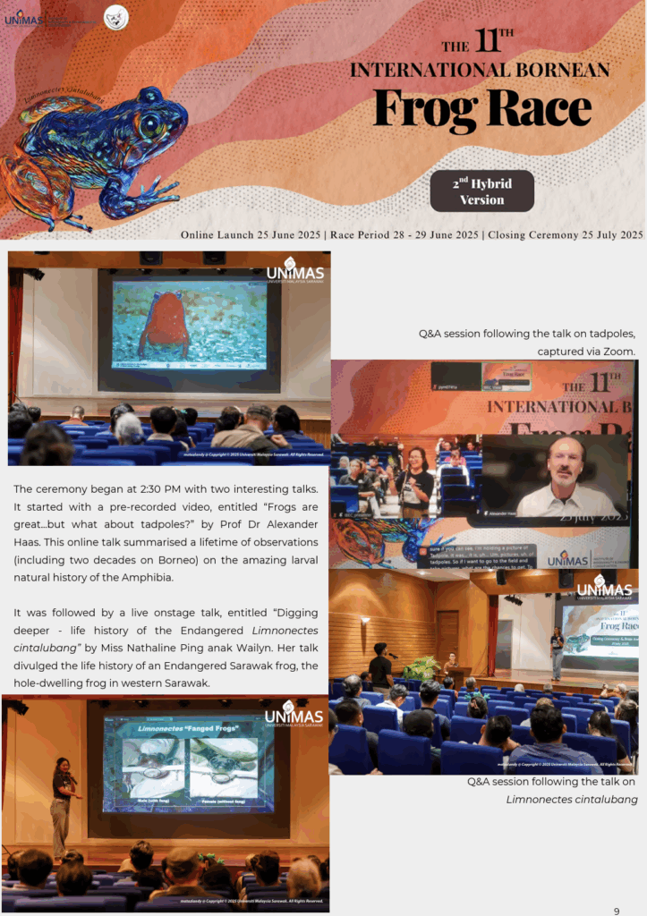 This year’s closing event was addressed by Professor Dr Ahmad Hata Rasit, Vice Chancellor, UNIMAS, who mentioned that the International Bornean Frog Race is a citizen’s conservation movement that draws public attention to Sarawak and Borneo’s rich biological diversity. The chief components of this year’s Race included a photographic competition, the event also including talks on amphibians and on mobile photography, vendor exhibition, documentary screening and sale of merchandize. The Race itself pits participants in a competition to find and photograph amphibian species, across Borneo on the nights of 28 and 29 June 2025.