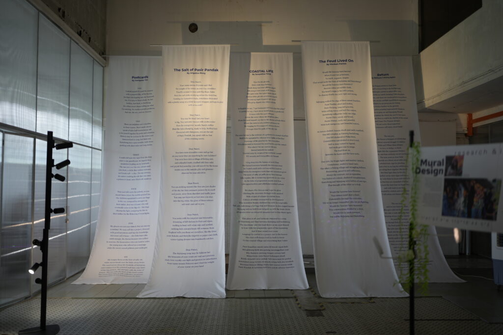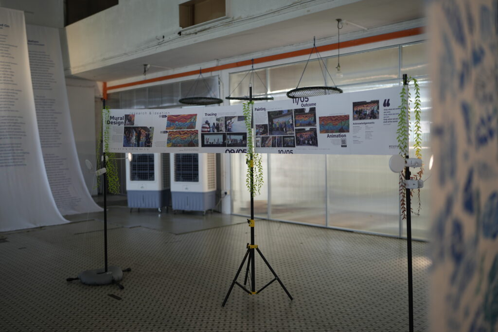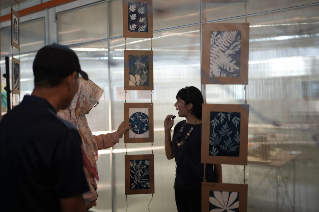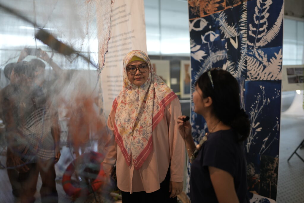 The exhibition showcases a variety of creative outputs by renowned local and international artists, student artists, researchers, and Pasir Pandak community members who worked closely in co-creating works such as cyanotype printing, leaf printing, as well as a documentation of the creative processes behind the mural and installation at Pasir Pandak. These artworks represent more than artistic impressions, but rather depicts the emotions, reflections and hopes for taking lead and moving forward growing efforts on nurturing environmental awareness and conservation in coastal communities.