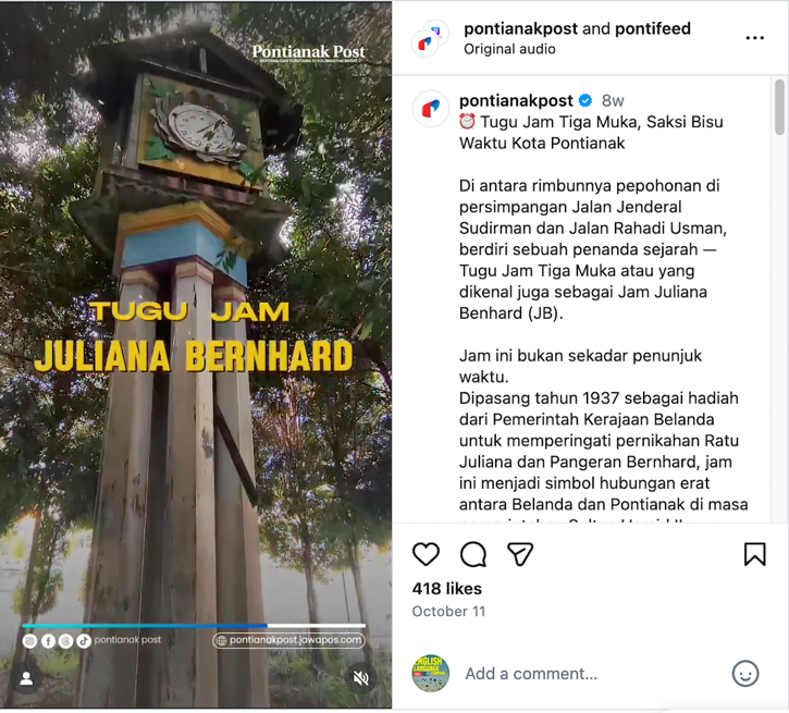 The historic Tugu Jam Tiga Muka (Jam Juliana Bernhard), installed in 1937, regained public attention after a digitally enhanced video went viral, prompting restoration efforts in Pontianak.