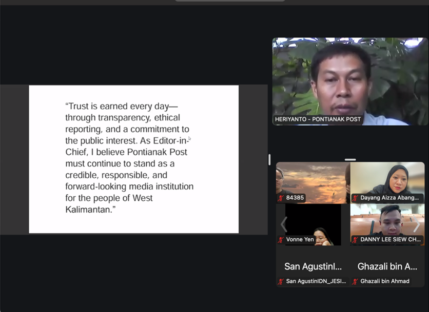 Social media ethics formed another major focus of the session. Instagram-based visual storytelling was discussed as an effective tool for audience engagement, with the viral story of Durian Jemongko in Entikong serving as a case example. The viral coverage brought renewed attention to the border town between Indonesia and Malaysia and contributed to increased local durian sales. Such engagement may benefit local communities, but Heriyanto advised that viral culture must not compromise verification, context, and journalistic responsibility.