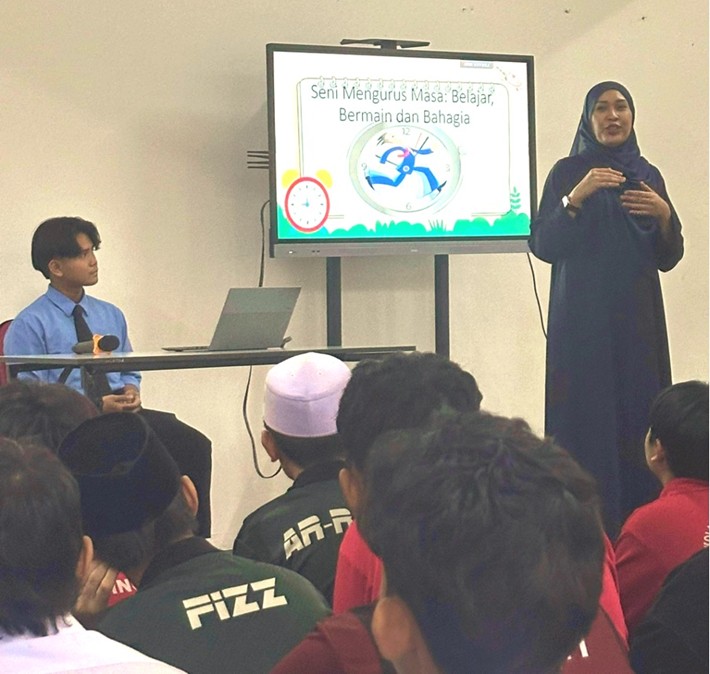 Madam Norlina binti Haji Kadri Ali engaging students titled “Seni Pengurusan Masa”, which emphasised effective planning, discipline, and prioritisation to help students manage their time efficiently.
