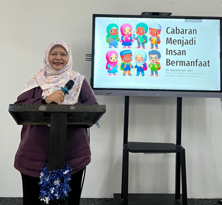 Dr. Nazaria binti Md. Aris sharing insights on resilience, positive values, and the role of students in contributing meaningfully to society in her talk “Cabaran Menjadi Insan Bermanfaat”.