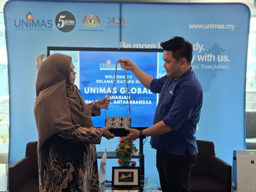 The delegation, led by YBrs. Dr Suhana Koting, was warmly welcomed by YBrs. Mr Thian Foong Fatt, Director of UNIMAS Global, together with the UNIMAS Global team. Prior to attending an official university meeting, Mr Thian took the opportunity to present a souvenir to Dr Suhana as a token of appreciation and goodwill, symbolising mutual respect and the strong spirit of inter-university collaboration.